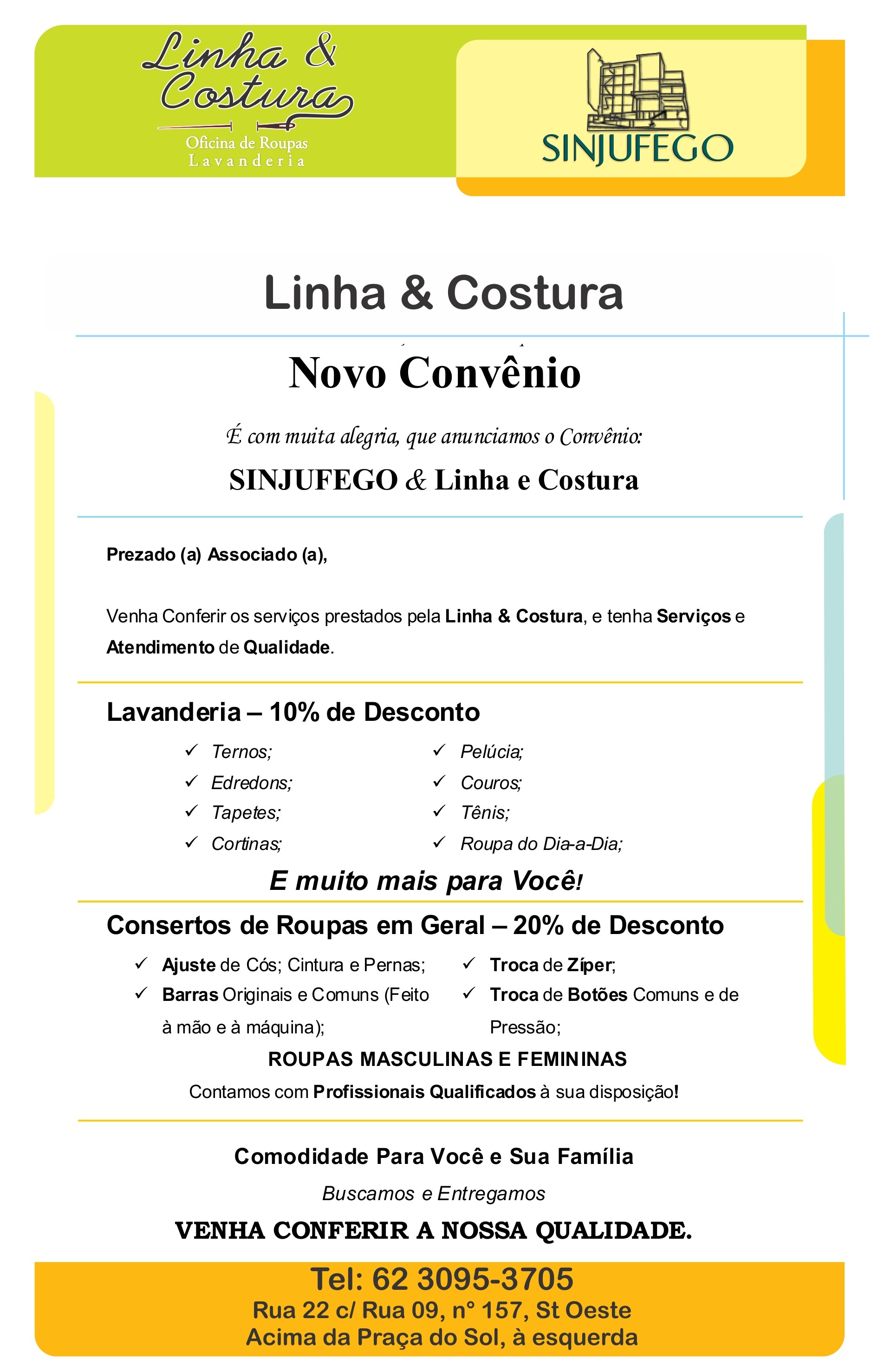 Desconto: O valor do desconto oferecido é de 10% (Dez por Cento) em serviços de lavanderia e 20% ( Vinte por Cento) em serviços de consertos de roupas, pagamento à vista ou cartão