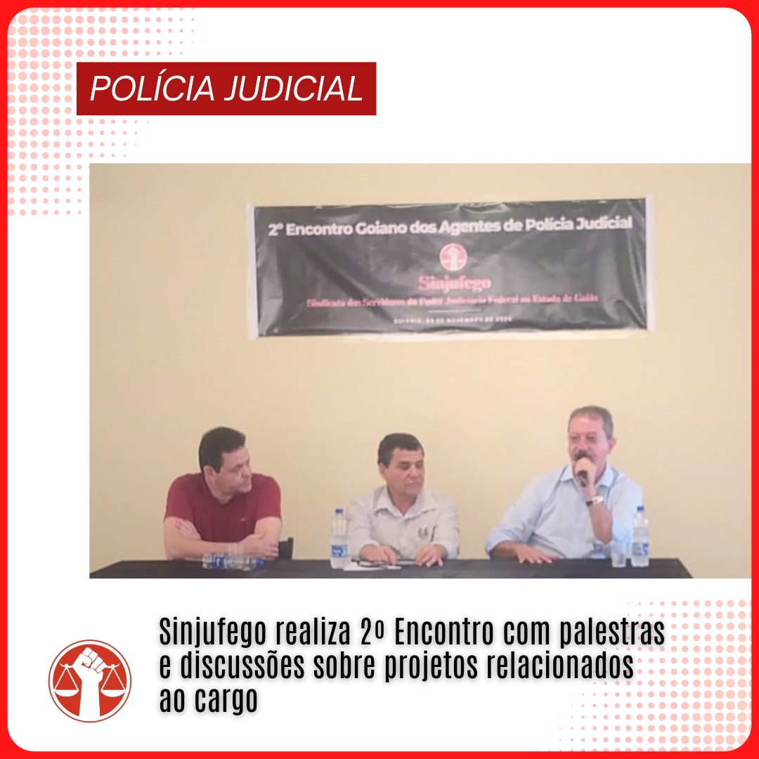 No último sábado (23/11), foi realizado, na Sede do Sinjufego, o 2º Encontro Goiano de Agentes de Polícia Judicial com palestra sobre a forma de atuação da inteligência do policial judicial na proteção patrimonial e de pessoal. Na ocasião, também foram debatidos projetos relacionados ao cargo e realizada uma homenagem simbólica ao APJ e ex-presidente do Sinjufego, Antônio Cézar Prazeres.